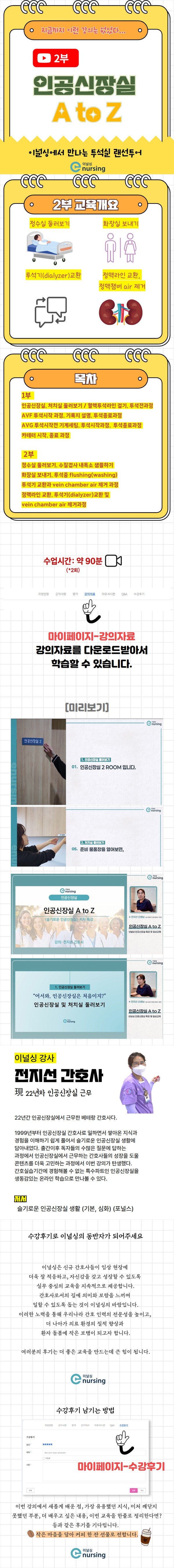 이번에 소개하는 ‘인공신장실 A to Z 2부’는 22년 차 인공신장실 경력을 보유한 전지선 간호사가 혈액투석 과정 전반을 임상 흐름에 맞춰 상세하게 설명한 강좌로, 신규 간호사뿐 아니라 경력 간호사에게도 실질적인 도움이 되도록 구성하였습니다.